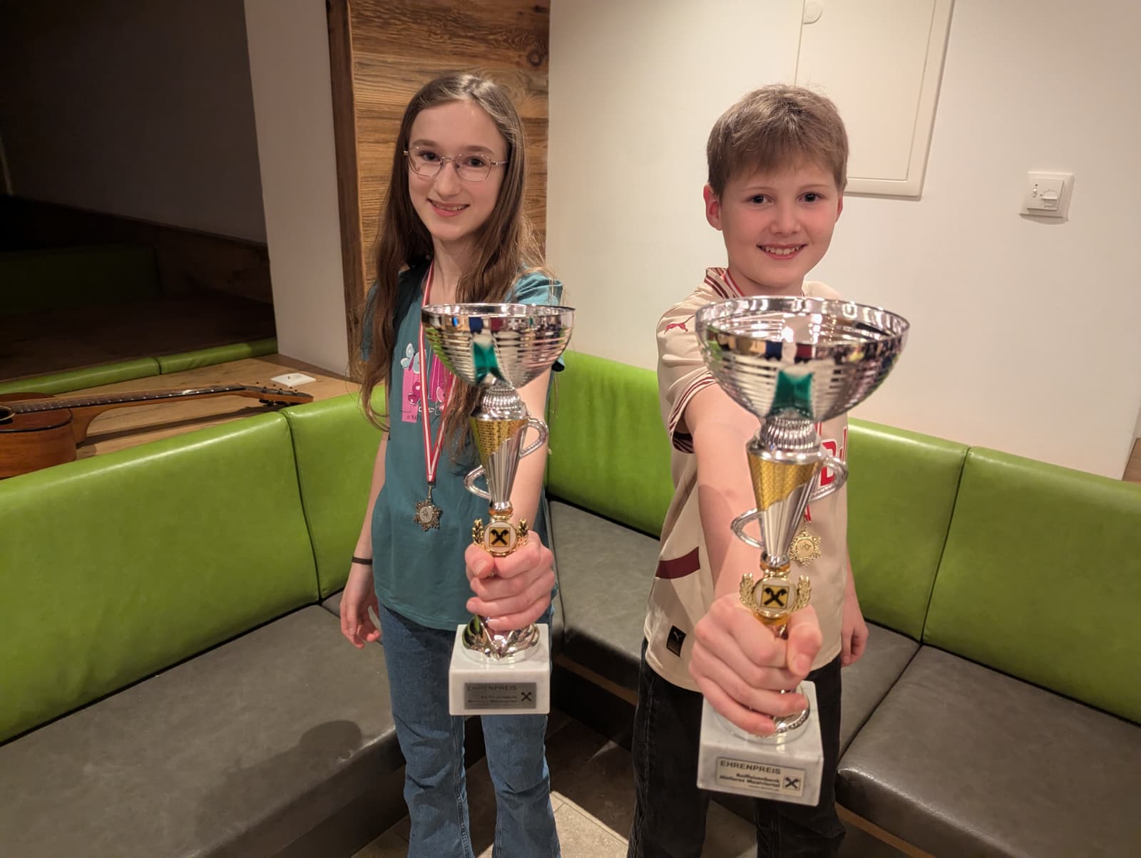Am Don­ners­tag stand dann noch unser Schi­kurs­ren­nen am Pro­gramm. Miri­am Holz­rei­ter und Mar­cel Fertl konn­ten sich die Tro­phä­en für die schnells­ten Schi­fah­rer sichern — Gratulation!