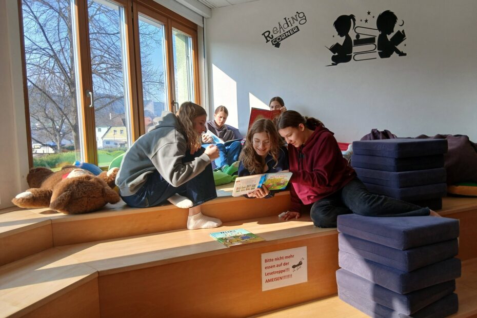 Die Deutsch AHS-Standard-Gruppe 4C besuchte im Rahmen der Osterzeit den Kindergarten. Die Mittelschülerinnen und Mittelschüler hatten liebevoll ausgewählte Geschichten vorbereitet und lasen sie den Kindergartenkindern vor. Mit viel Begeisterung und Neugierde tauchten die Kleinen in die bunten Erzählungen ein.